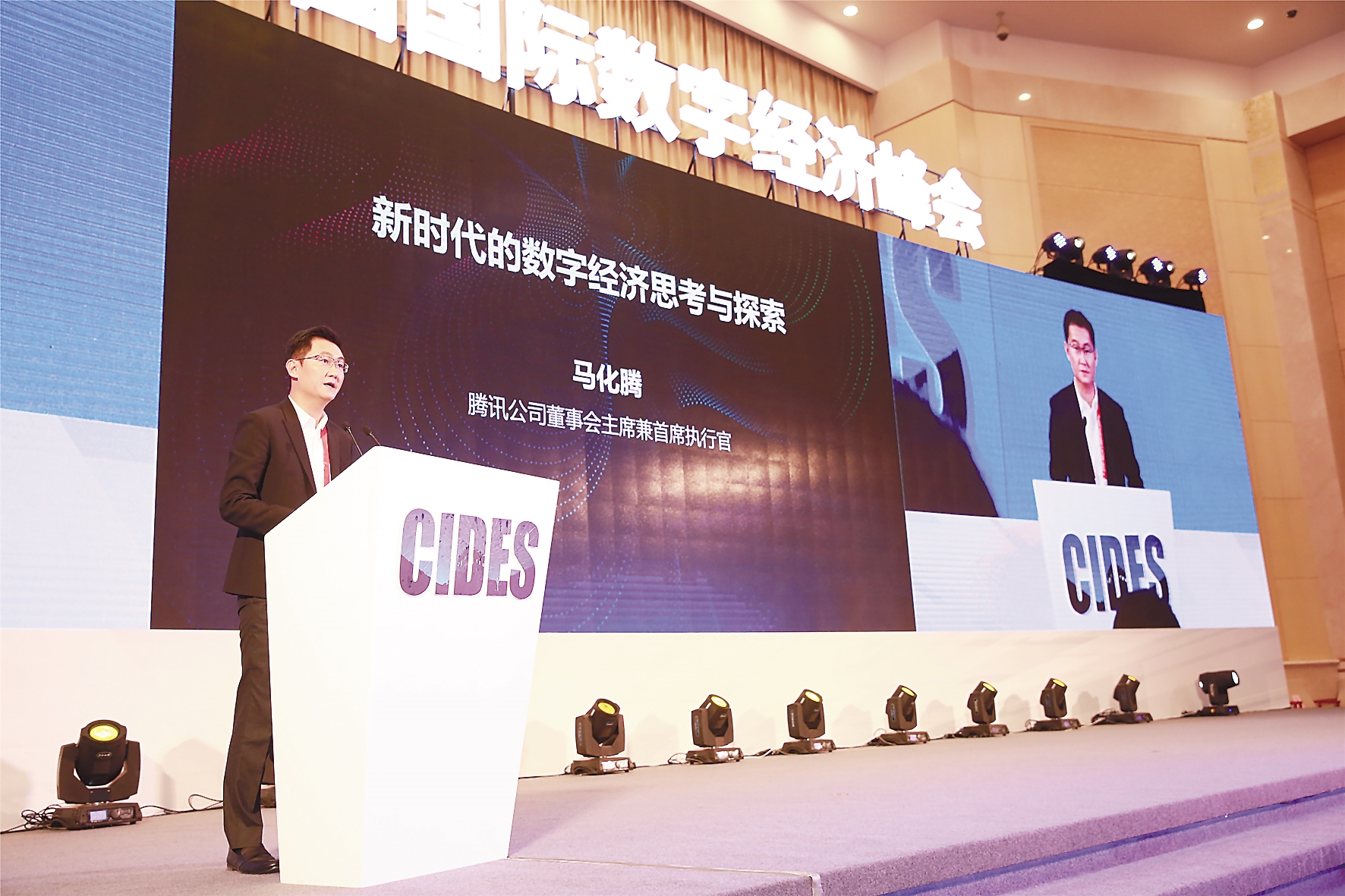 騰訊公司董事局主席兼首席執(zhí)行官馬化騰作主題演講。記者閆思宇攝