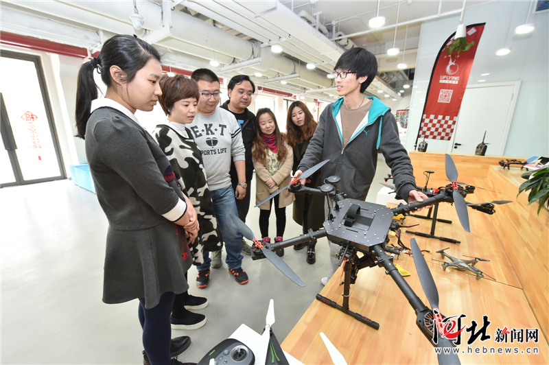 香河縣中信國安創(chuàng)客空間,創(chuàng)業(yè)者(右一)正向參觀者介紹自主研發(fā)的多旋翼無人機(jī)。記者霍艷恩攝