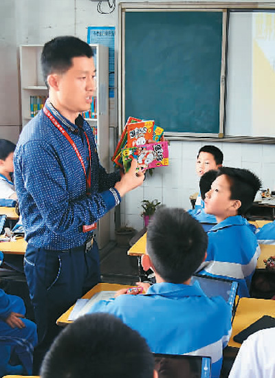 4月23日,江西省新余市分宜縣的執(zhí)法人員在分宜縣小學向?qū)W生講解盜版書籍的鑒別方法。周亮攝(人民視覺)