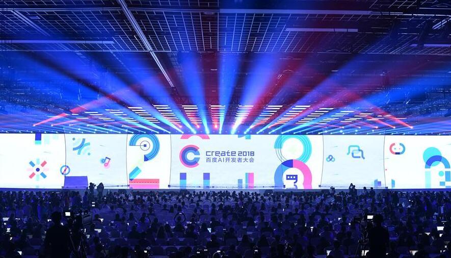 這是百度AI開發者大會主論壇現場(7月4日攝)。7月4日,百度AI開發者大會在北京國家會議中心舉行。新華社記者李鑫攝